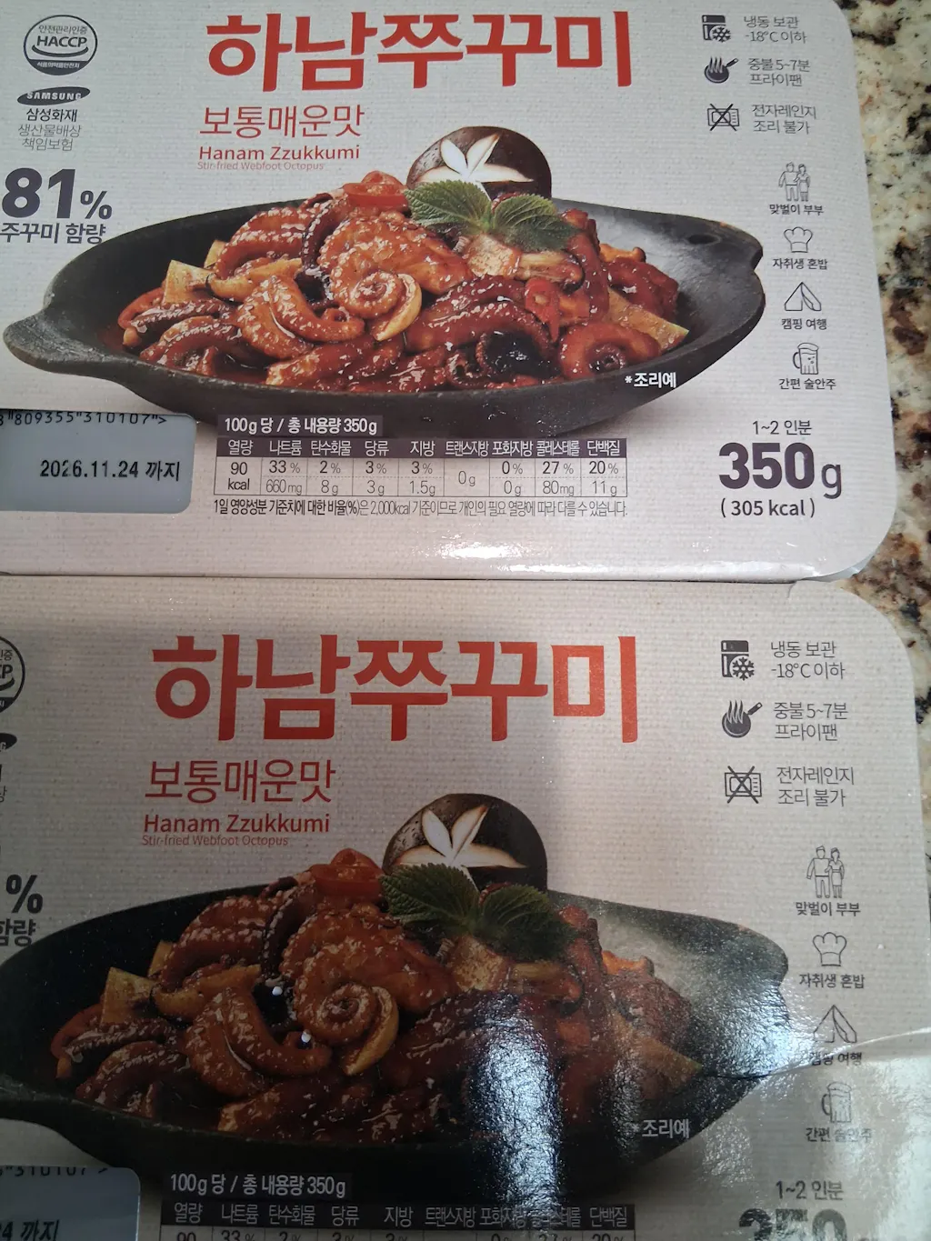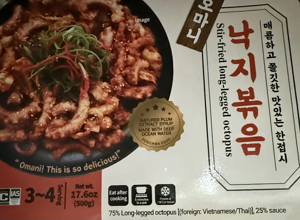 | 원재료명 | 낙지(외국산: 베트남/태국) 75%, 양념[고춧가루(중국산)23%, 고추장 18.5%, 해양심층수농푹수(국산) 14%, 마늘 , 매실청(국산) 7.4%, 갈색설탕, 올리고당, 생강, 볶음참깨, 땅콩분태, L-글루탐산나트륨(향미증진제), 기타식용유지, 참기름, 후추가루] 25% |
