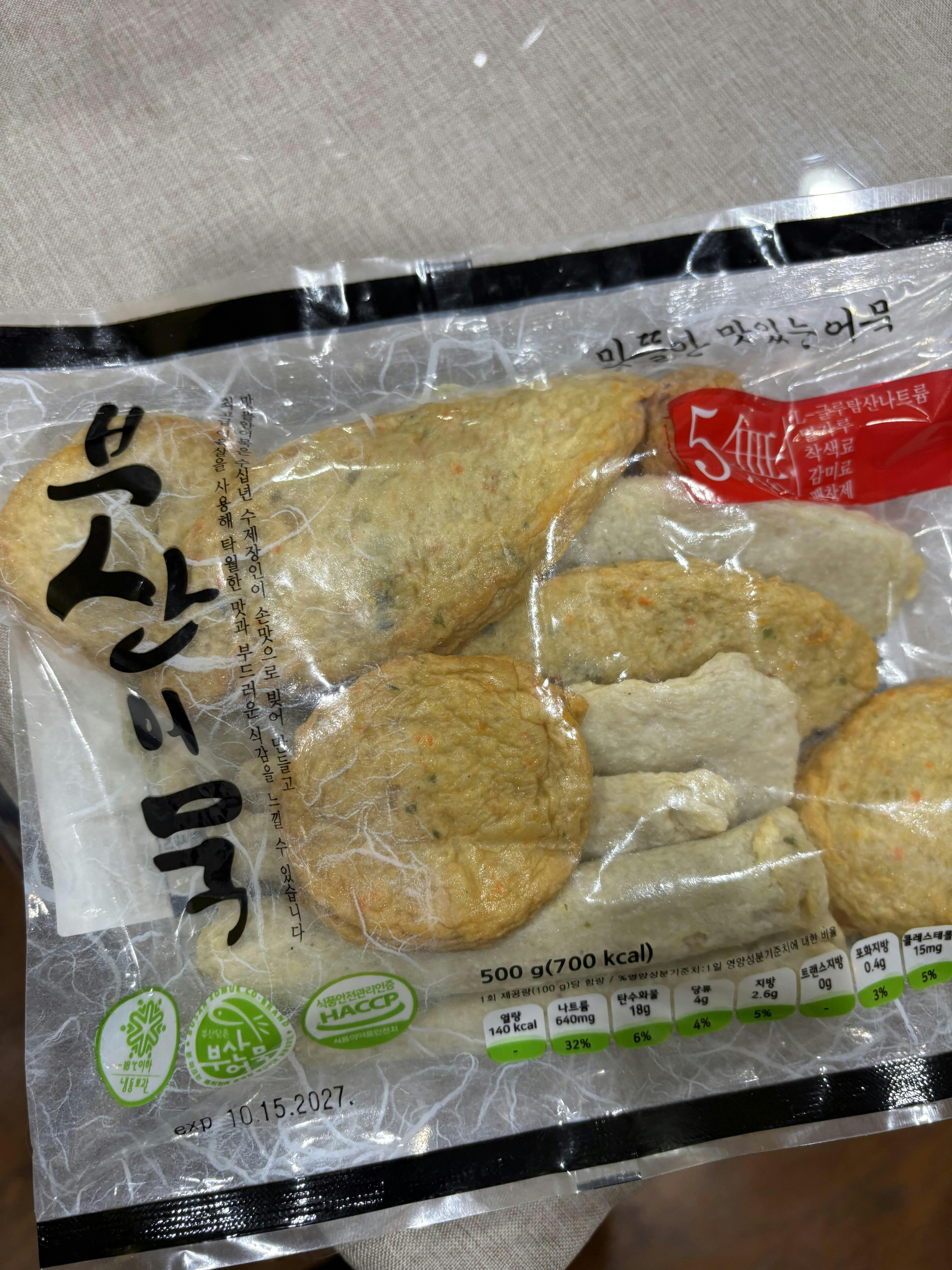 - 주요 성분: 생선살(황실돔), D-소르비톨, 설탕, 폴리인산나트륨, 계란, 가공전분(타피오카 전분, 말토덱스트린, 구아검), 쌀가루, 소금, 당근, 파, 양파, 부추, 마늘, 고추, 해초, 오징어, 대두유, 어묵 조미료(간장 분말, 참치 분말, 후추 분말, 소듐 숙신산, 마늘 분말, 양파 분말, 디소듐 5'-리보뉴클레오타이드), 글루코노 델타 락톤