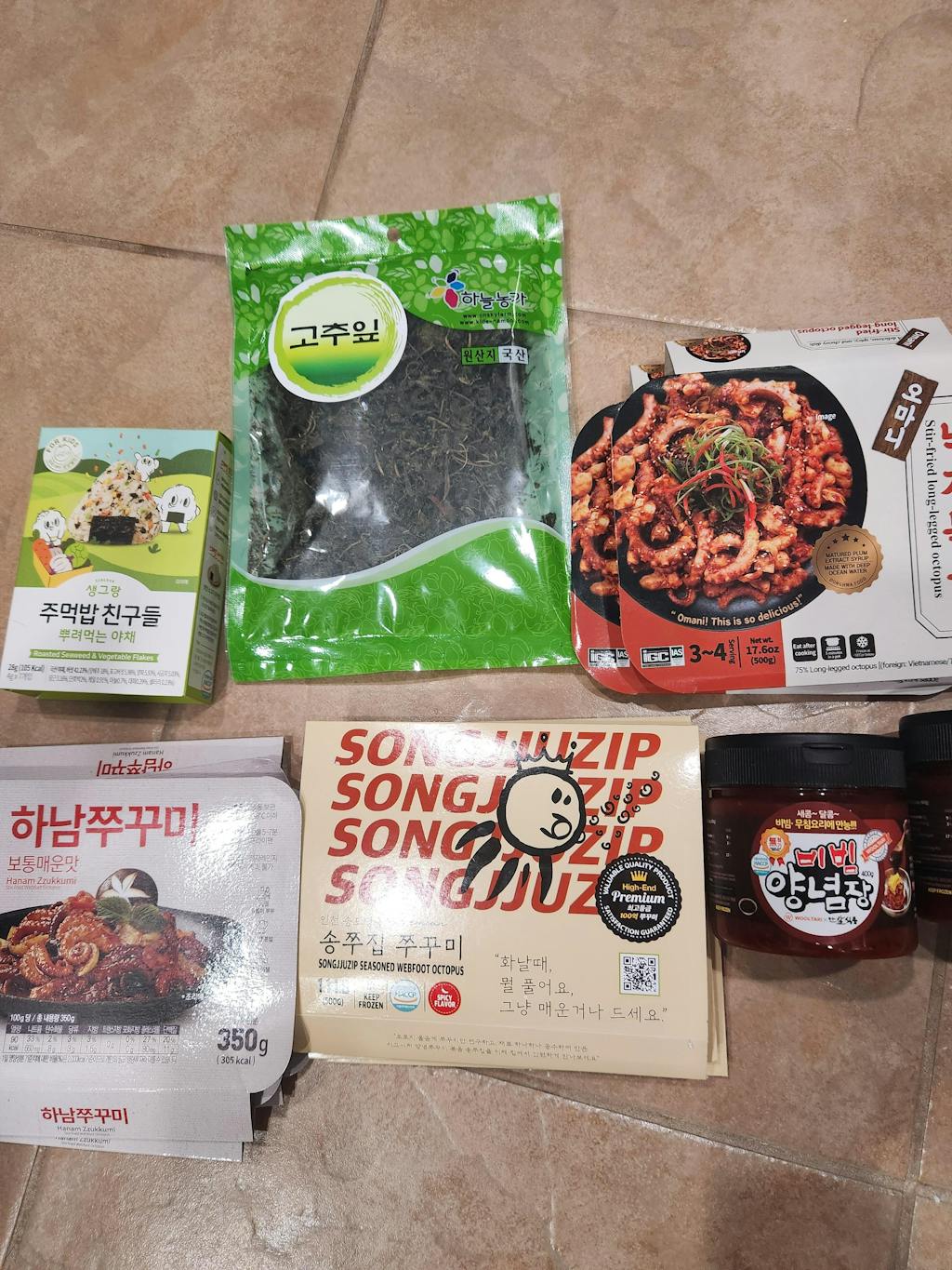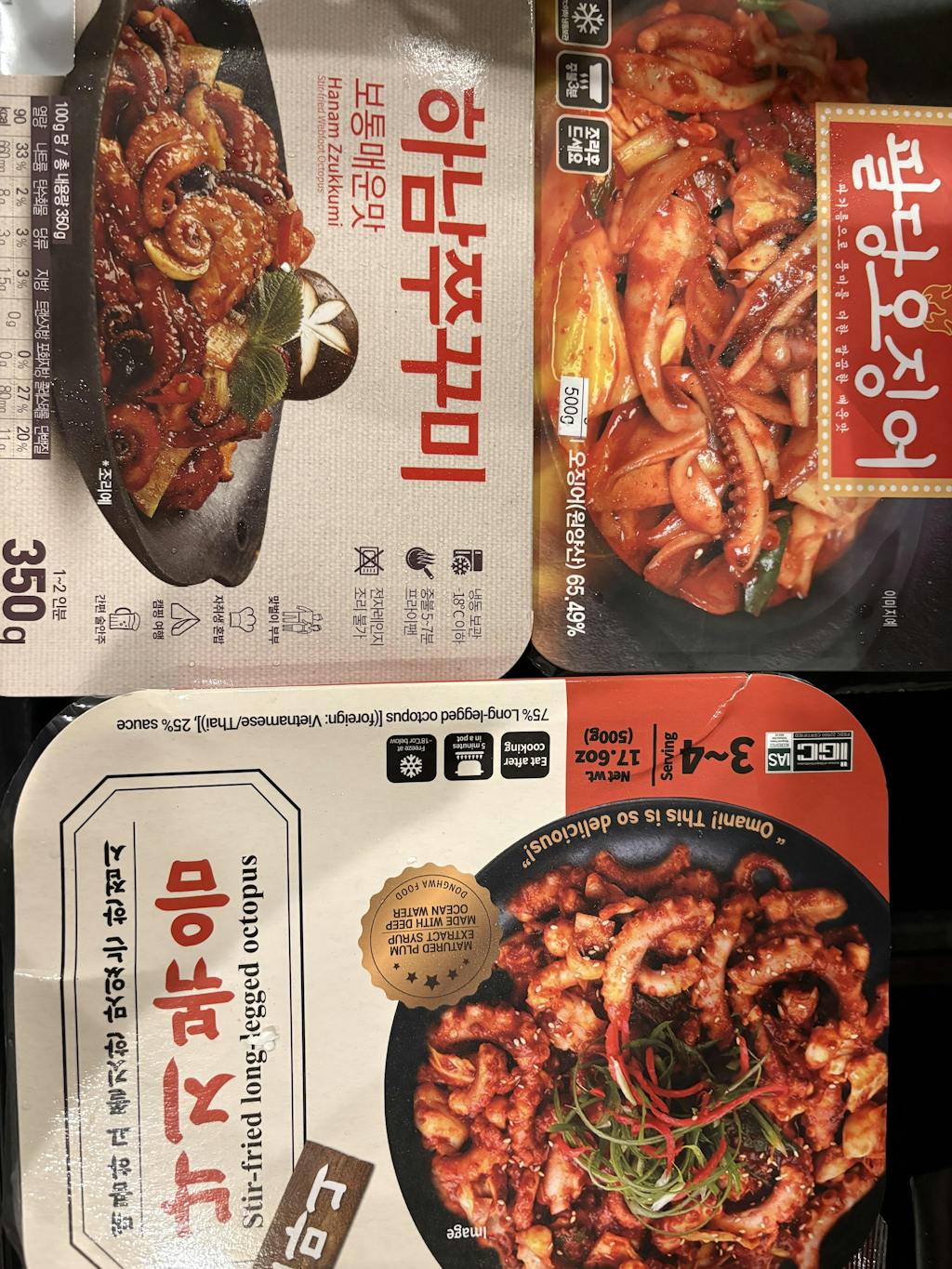| 원재료명 | 낙지(외국산: 베트남/태국) 75%, 양념[고춧가루(중국산)23%, 고추장 18.5%, 해양심층수농푹수(국산) 14%, 마늘 , 매실청(국산) 7.4%, 갈색설탕, 올리고당, 생강, 볶음참깨, 땅콩분태, L-글루탐산나트륨(향미증진제), 기타식용유지, 참기름, 후추가루] 25% |