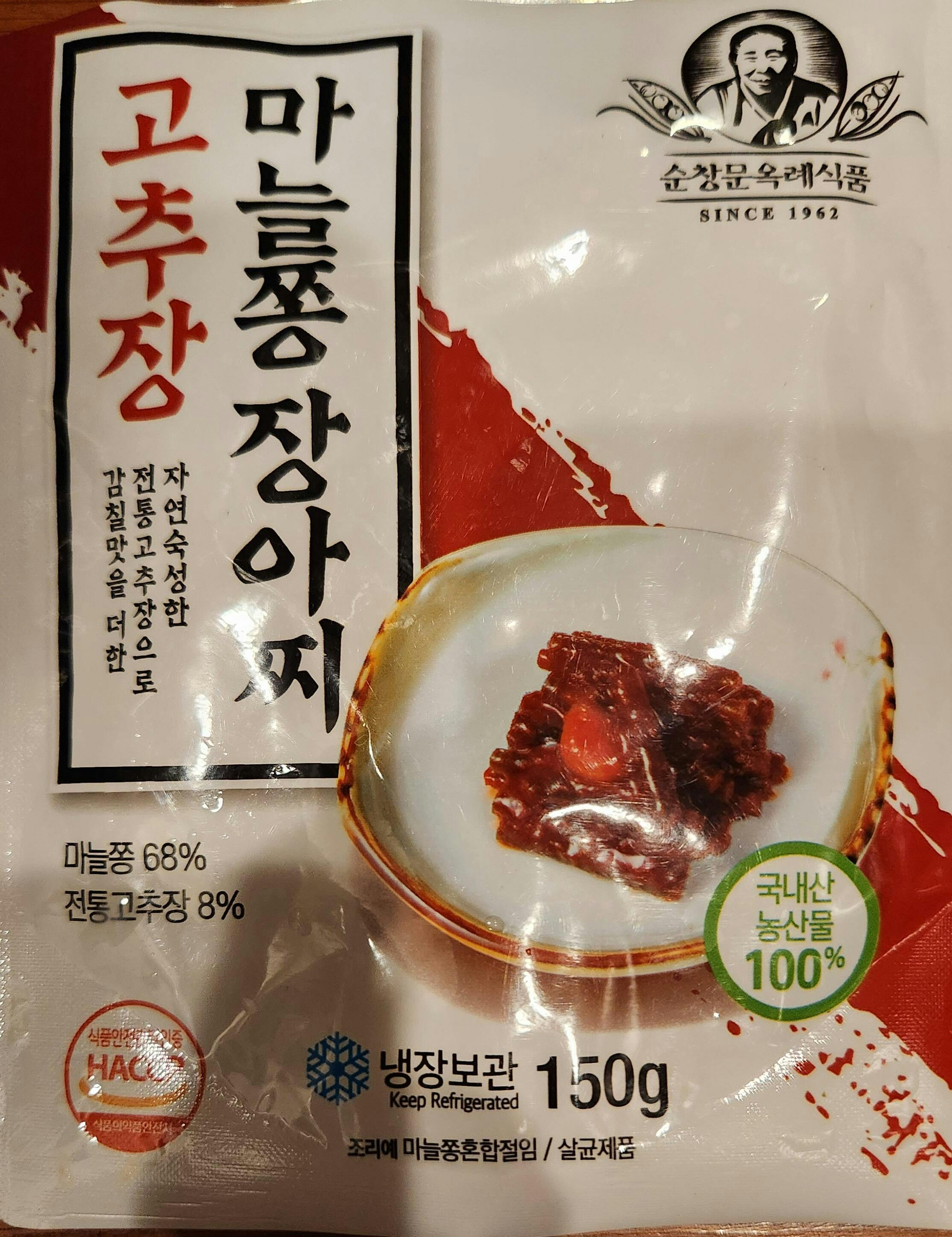 | 원재료명 | 마늘쫑68.0%(국산),마늘8.0%(국산),전통고추장8%[고춧가루23%(국산),찹쌀21%(국산),메주가루[대두(국산),맵쌀(국산)],엿기름(겉보리:국산),재래간장[대두(국산),천일염(국산)],물엿,고춧가루(국산),재래한식간장[한식메주26%[대두(국산)100%],천일염[국산],정수],정백당 |