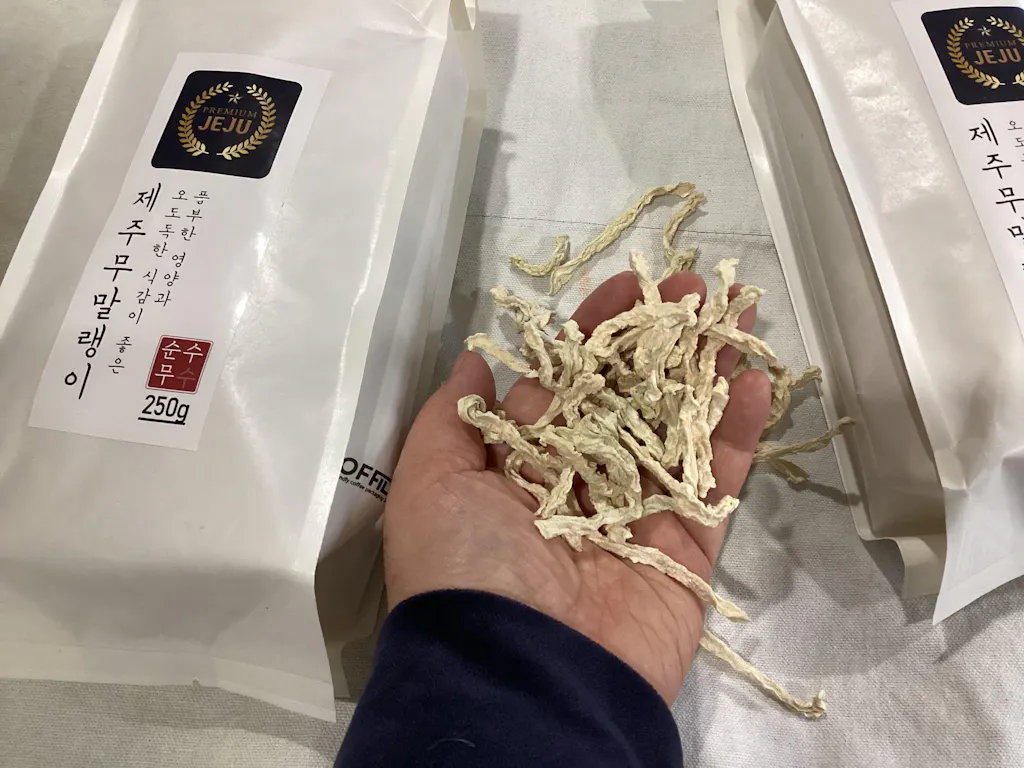 It is a product made by drying winter radish from 100% clean Jeju. It is rich in various nutrients and has a taste and texture that is different from ordinary radish.