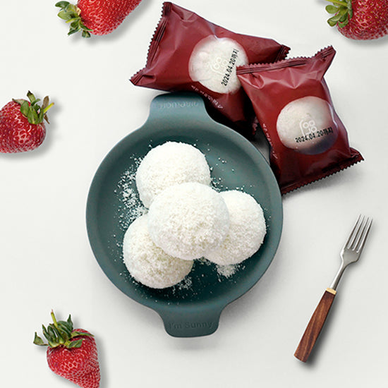 The tteok features a unique vanilla cream and strawberry jam within the chewy glutinous rice dough. The jam, made with organic fermented grain syrup, contains a generous 69% of locally sourced strawberries, delivering a rich and unforgettable flavor.